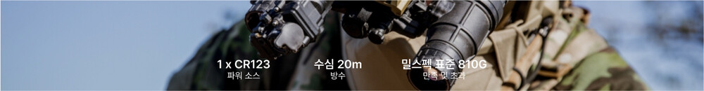| 방수 / 충격 / 내구성 | 방수 20 m (66 ft) / 2시간, 염수 내식성, MIL-STD-810 / SOCOM 낙하·충격 시험 통과 |